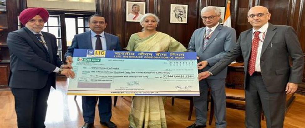 देश की सबसे बड़ी बीमा कंपनी भारतीय जीवन बीमा निगम (एलआईसी) ने भारत सरकार को 2,441 करोड़ रुपए का डिविडेंड चेक दिया। इस बारे में वित्त मंत्री निर्मला सीतारमण ने सोशल मीडिया प्लेटफॉर्म एक्स पर जानकारी देते हुए लिखा है कि एलआईसी के चेयरमैन सिद्धार्थ मोहंती ने 2,441.44 करोड़ रुपए का डिविडेंड चेक सौंपा है। वित्तीय सेवा सचिव विवेक जोशी की उपस्थिति में लाभांश चेक वित्त मंत्री को सौंपा गया।