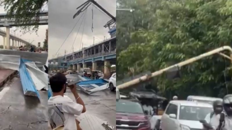 दिल्ली में बारिश और तेज हवाओं के कारण मेट्रो की टीन हवा में ही उड़ गई। घटना न्यू अशोक नगर मेट्रो के पास की है। जानकारी के अनुसार टीन उड़कर एक गाड़ी पर गिरी। इससे गाड़ी को भी नुकसान पहुंचा है। वहीं फिलहाल मौके से मेट्रो के कर्मचारी टीन को हटाने में जुट गए है। वहीं इस घटना में किसी के हताहत होने की खबर नहीं है। उधर तेज हवाओं के कारण नोएडा के डीएम चौक पर ट्रैफिक लाइट का पोल सड़क पर झूल गया। हालांकि वह पूरी तरह से उखड़ा नहीं है। इसका एक वीडियो भी सामने आया है। वहीं नोएडा सेक्टर 9 में तेज हवा के कारण पेड़ उखड़ गया। इससे नीचे खड़ी गाड़ियों को भारी नुकसान पहुंचा।