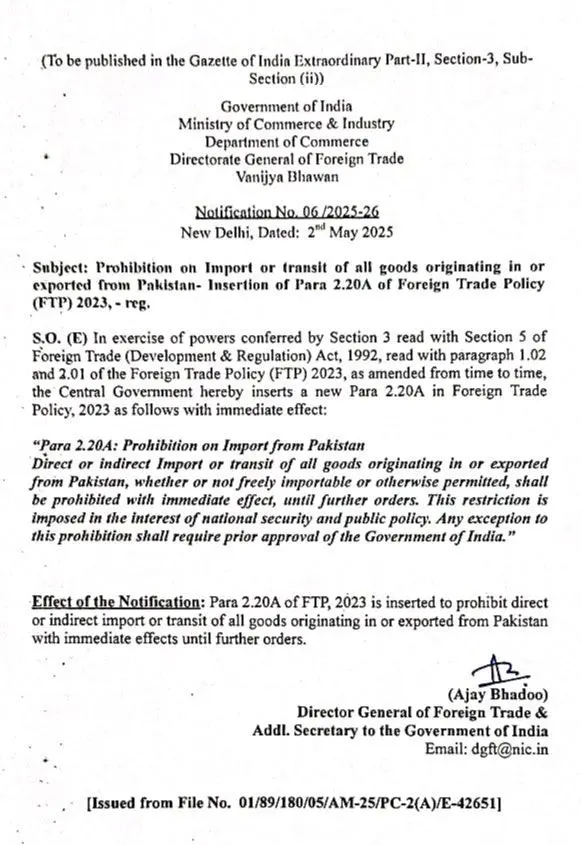 केंद्रीय वाणिज्य और उद्योग मंत्रालय के अधीन विदेश व्यापार महानिदेशालय (DGFT) ने व्यापार बंद करने की अधिसूचना जारी कर दी है। आदेश के मुताबिक, विदेश व्यापार नीति 2023 में एक नया पैरा 2.20A जोड़ा गया है, जिसका शीर्षक ‘पाकिस्तान से आयात पर प्रतिबंध’ है। प्रतिबंध राष्ट्रीय सुरक्षा और सार्वजनिक नीति के हित में लगाया गया है। इस पर कोई भी छूट केवल भारत सरकार की पूर्व स्वीकृति के बाद ही दी जा सकेगी। भारत के इस आदेश का सीधा असर उन व्यापारिक सौदों पर पड़ेगा, जिनमें पाकिस्तान से वस्तुओं का आयात होता था या जहां पाकिस्तान किसी सप्लाई चेन का हिस्सा था। भारत सरकार ने साफ संदेश दिया है कि सुरक्षा और आत्मनिर्भरता के मामलों में कोई समझौता नहीं किया जाएगा।