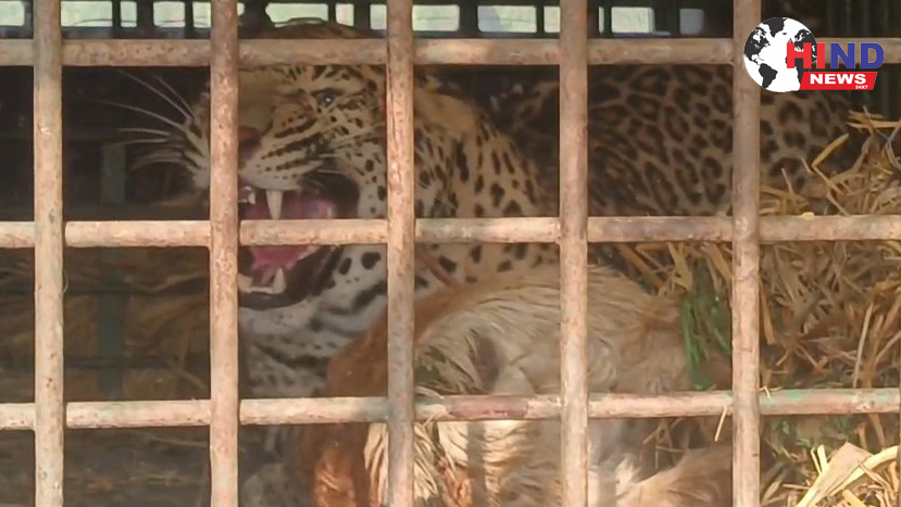पिंजरे के माध्यम से कैद किया गया तेंदुआ