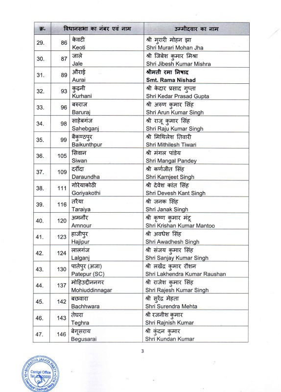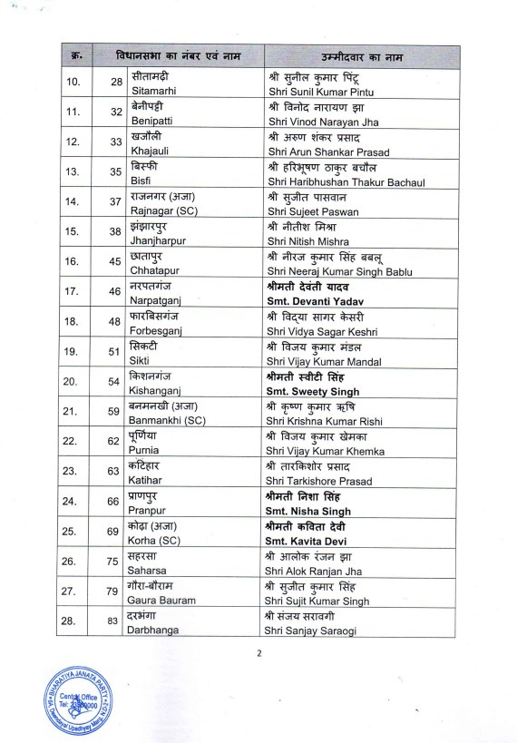 औरंगाबाद से त्रिविक्रम नारायण सिंह और छातापुर से नीरज बबलू को चुनावी रण में उतारा गया है. रामकृपाल यादव को दानापुर से, मंत्री नितिन नबीन को बांकीपुर से, संजय सरावगी को दरभंगा से, नीरज कुमार बबलू को छातापुर से, पूर्व डिप्टी CM रेणु देवी को बेतिया से और पूर्व डिप्टी CM तारकिशोर प्रसाद को कटिहार से टिकट दिया गया है.
