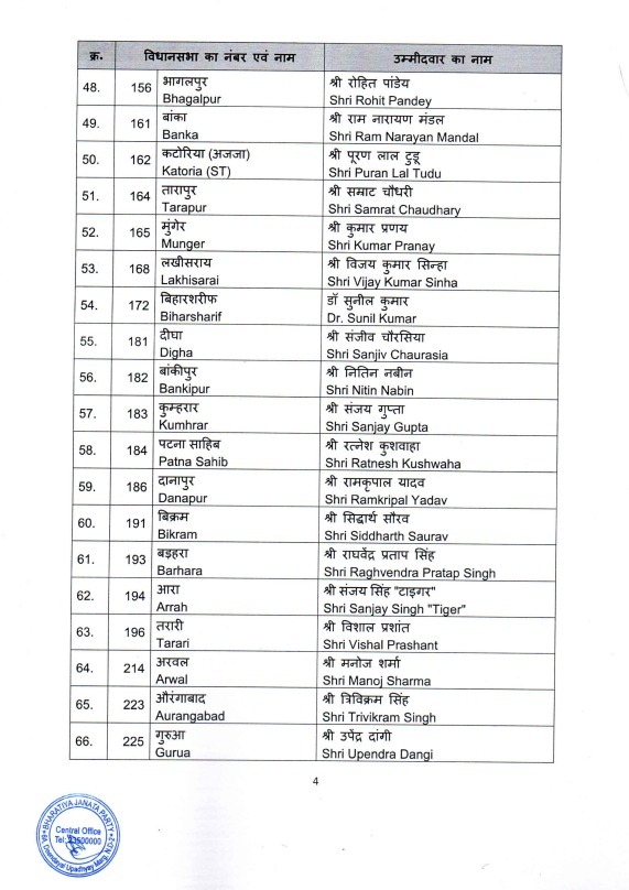 BJP Candidates List: बिहार विधानसभा चुनाव 2025 के लिए BJP के 71 उम्मीदवारों की पहली लिस्ट जारी हो गई है, जिसमें प्रदेश के दोनों वर्तमान उपमुख्यमंंत्रियों समेत ज्यादातार मौजूदा विधायकों को टिकट दिया गया है. सम्राट चौधरी तारापुर से और विजय कुमार सिन्हा लखीसराय से चुनाव लड़ेंगे.