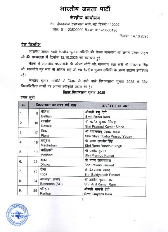BJP Candidates List: भारतीय जनता पार्टी (BJP) ने बिहार विधानसभा चुनाव 2025 के लिए अपने उम्मीदवारों की पहली सूची जारी कर दी है, जिसमें 71 उम्मीदवारों के नामों का ऐलान किया गया है. पहली सूची में BJP ने ज्यादातर मौजूदा विधायकों को टिकट दिया है. वहीं पहली सूची में दोनों डिप्टी CM सम्राट चौधरी और विजय कुमार सिन्हा का भी नाम है.