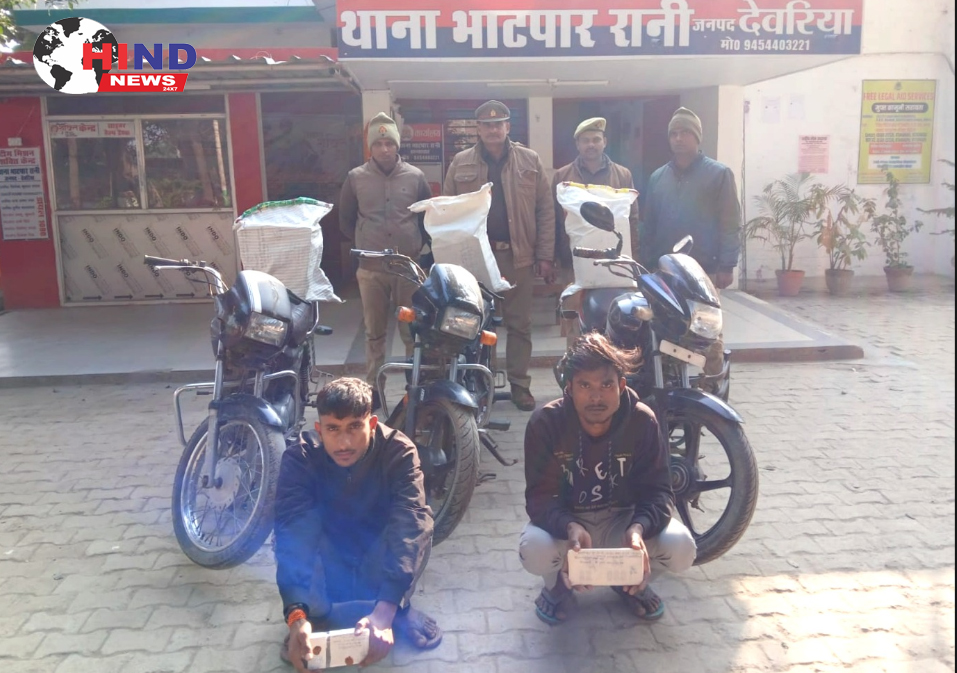 जनपद देवरिया में अपराधियों और अवैध शराब तस्करों के खिलाफ चलाए जा रहे विशेष अभियान “ऑपरेशन प्रहार” के तहत भाटपाररानी पुलिस को बड़ी सफलता हाथ लगी है। पुलिस ने चोरी की तीन मोटरसाइकिलों, 54 लीटर अवैध देशी शराब और दो फर्जी नंबर प्लेट के साथ दो अभियुक्तों को गिरफ्तार किया है।